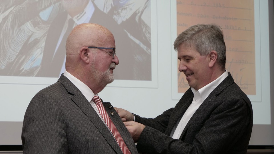 WFV-Vizepräsidenr Steffen Jäger: "Sie haben es wirklich wahrlich verdient. Ich habe selber 25 Jahre lang aktiv Fußball gespielt. Zunächst beim Heimatverein in Aldingen, später beim VfL in Nendingen. Das schöne ist, wir sind heute im schönen Rottweil, aber es fühlt sich doch wie ein Heimspiel an, weil wir alle schon von Kindesbeinen an den Fußball im Herzen tragen. Bei Winfried schlagen zwei Herzen in seiner Brust. Wenn es um den Sport geht, hat er auch ein ganz großes Herz für das Ringen. Da hat er auch große Verdienste in der Ringerabteilung des VfL erworben.