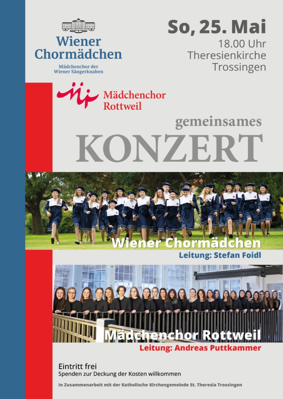 Es ist sicherlich schon etwas Besonderes, wenn sich zwei traditionelle Mädchenchöre für ein gemeinsames Konzert treffen: Die Wiener Chormädchen und der Mädchenchor Rottweil laden am Sonntag, 25. Mai, um 18 Uhr zu einem Chorkonzert in die katholische Theresienkirche in Trossingen ein. Derzeit sind die Wiener Sängerinnen auf einer Konzertreise durch Deutschland und besuchen dabei ihre Rottweiler Kolleginnen.