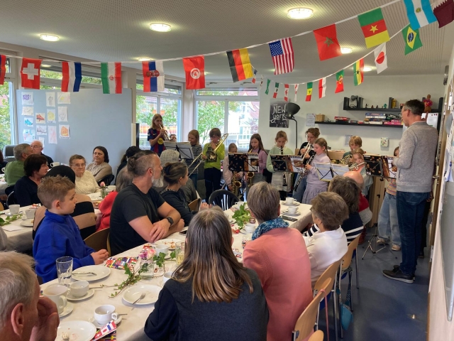 Die Gäste schlemmten sich bei italienischen Cantuccini, türkischem Baklava, griechischem Joghurt, bulgarischen und polnischen Kuchen, russischen Pfannkuchen, Zwetschgen- und Käsekuchen aus Deutschland Gebäck aus dem Kosovo quer durch das bunte Buffet, begleitet von der wunderbaren Musik der beiden Bläsergruppen unter der Leitung von Johannes Nikol.