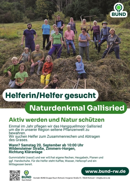 Um dieses „Juwel der Artenvielfalt" zu erhalten, sollte einmal im Jahr das alte Grüngut abgemäht und abgetragen werden. Daher treffen wir uns wieder einmal mit guter Laune, Gummistiefeln, Handschuhen, Plane und Rechen (einige Geräte stehen zur Verfügung, wer hat kann gerne eigene mitbringen) am 20. September 2025 ca. ab 10:00 Uhr im Gallisried in Horgen (Wildensteiner Straße, Richtung Kläranlage). Motivierte Helfer können sich unter info@bund-rw.de anmelden, damit wir Getränke und Snacks gut kalkulieren können, oder einfach so vorbeischauen.