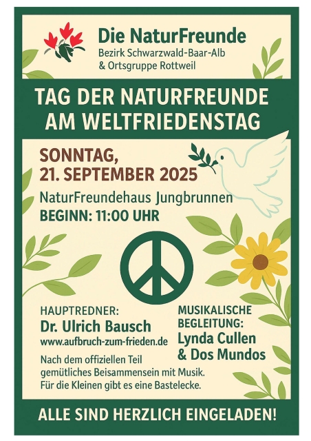 Die Naturfreunde der Region feiern am Sonntag, 21. September 2025, dem „Internationalen Tag des Friedens“, ihren Naturfreundetag und zeigen damit, dass sie auch in der Friedensbewegung aktiv sind.