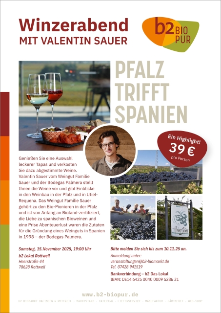 Valentin Sauer vom Weingut Familie Sauer und der Bodegas Palmera stellt Ihnen die Weine vor und gibt Einblicke in den Weinbau in der Pfalz und in Utiel-Requena. Das Weingut Familie Sauer gehört zu den Bio-Pionieren in der Pfalz und ist von Anfang an Bioland-zertifiziert, die Liebe zu spanischen Bioweinen und eine Prise Abenteuerlust waren die Zutaten für die Gründung eines Weinguts in Spanien in 1998 - der Bodegas Palmera.