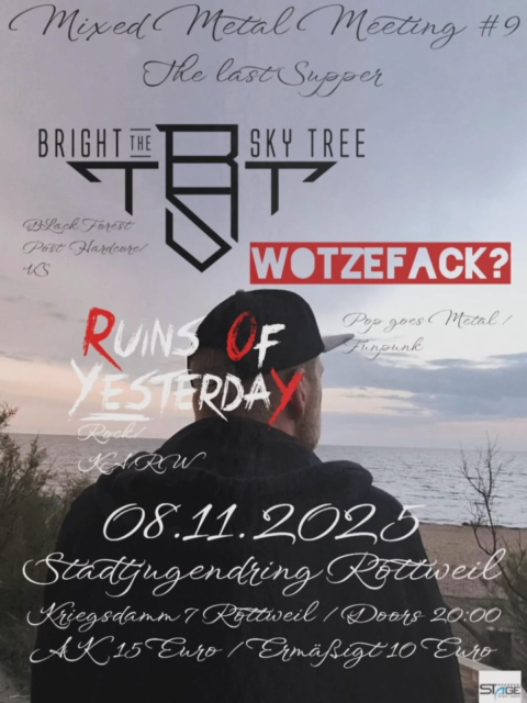 Ein Abend voller Energie, Emotion und harter Klänge erwartet euch im Stadtjugendring Rottweil. Drei Bands aus unterschiedlichen Ecken der Rock- und Metalwelt sorgen für ein Finale, das niemand verpassen sollte!