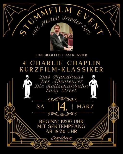 Stummfilm-Event mit Live-Klavierbegleitung: Vier unvergessliche Charlie-Chaplin-Klassiker werden am 14. März um 19 Uhr von Pianist Frieder Egri live vertont. Ein humorvoller Abend voller Nostalgie, Musik und bester Unterhaltung.